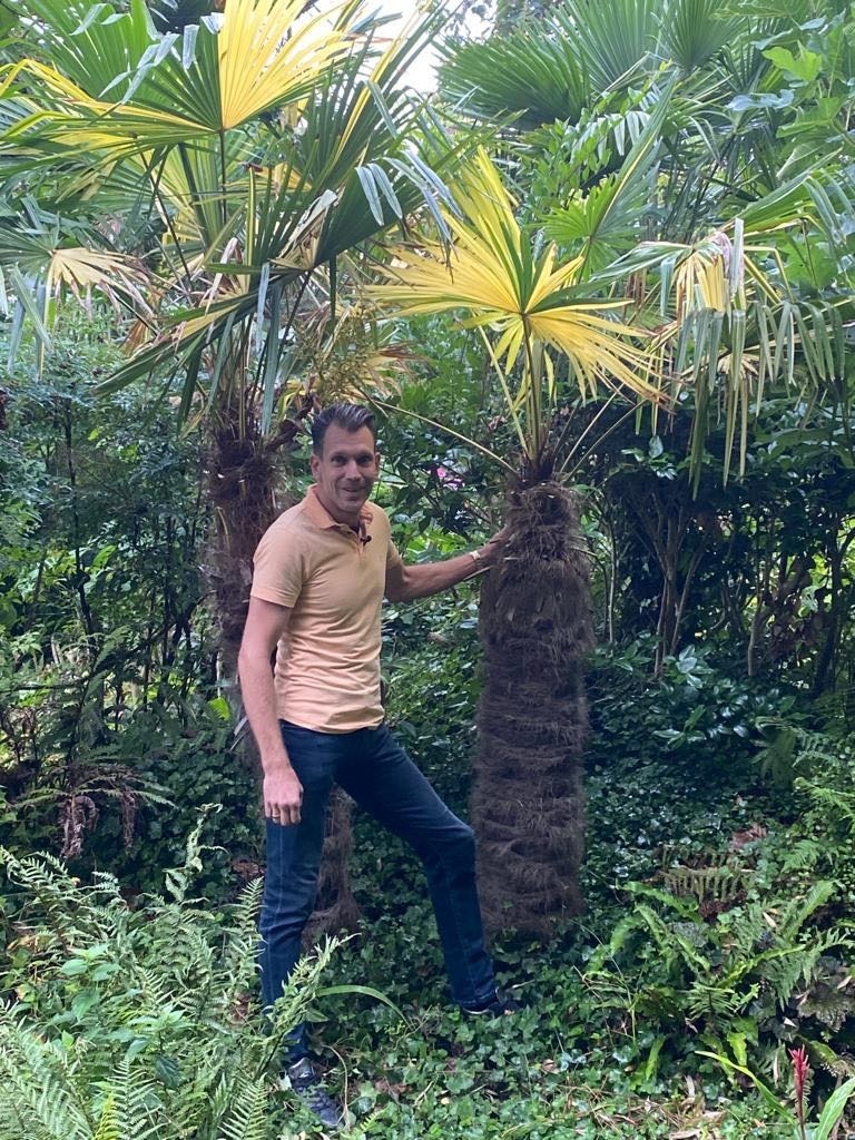 Seeds come from the palms shown in the photo in our own garden. The cross is Trachycarpus Fortunei Variegata X Trachycarpus Fortunei Variegata.